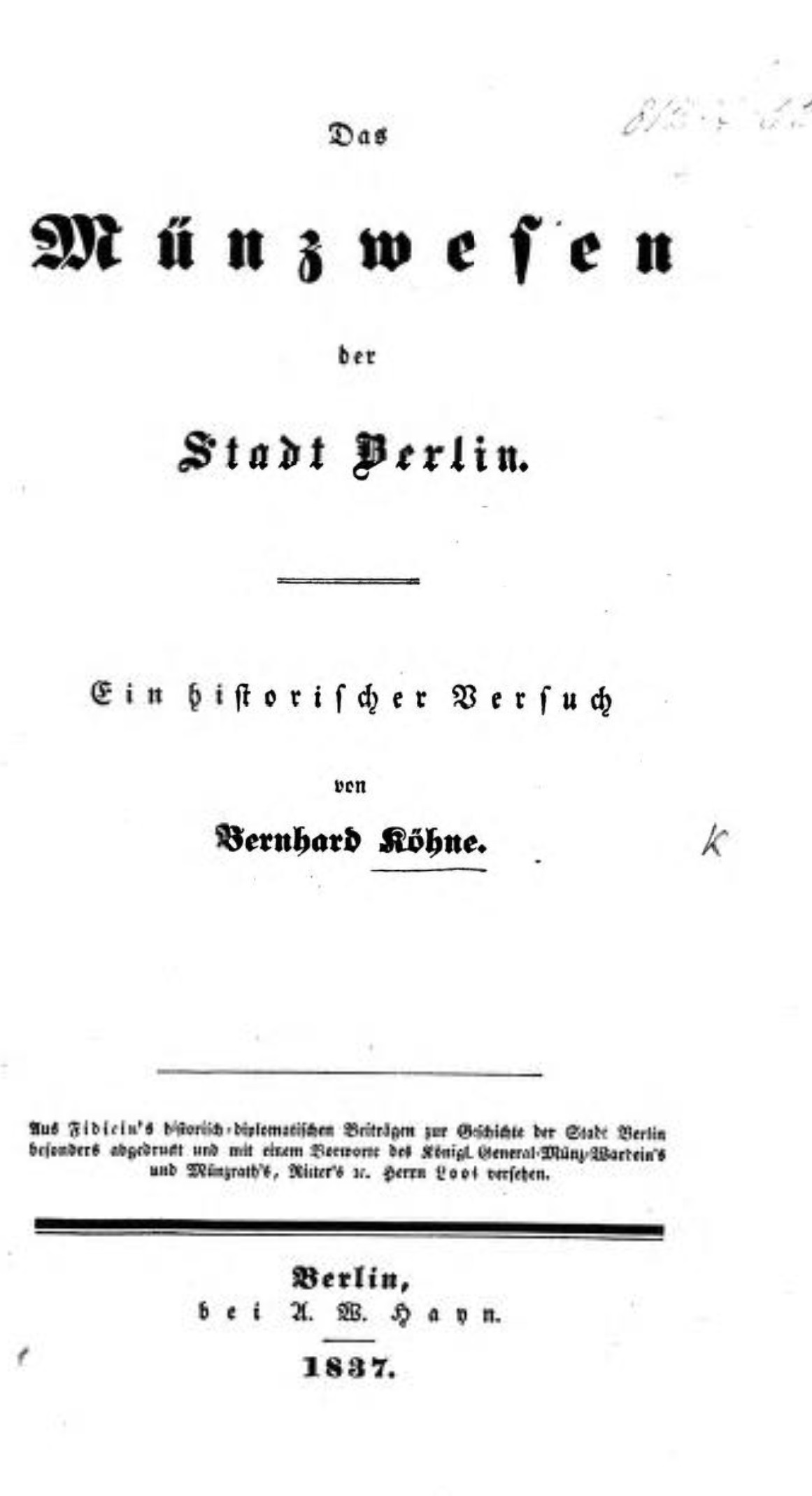 Das Münzwesen der Stadt Berlin. Ein historischer Versuch.1837 BT: 7476 Standort: London - British Library Signatur: 812.f.53.