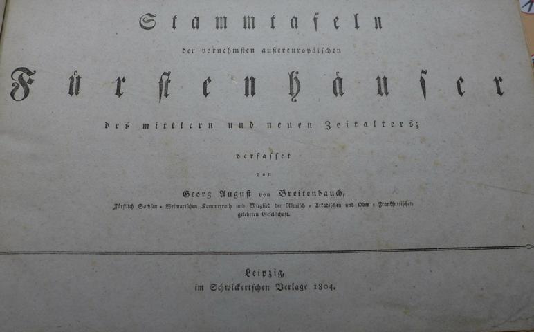 Stammtafeln der vornehmsten außereuropäischen Fürstenhäuser des mittlern und neuen Zeitalters.1804 BT: 4890 Standort: London - British Library Signatur: 559*.a.35.
