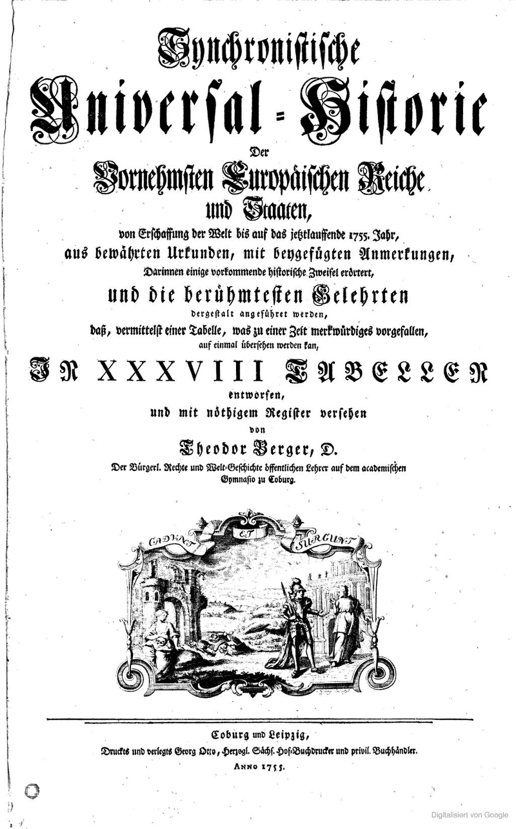 Synchronistische Universal-Historie der vornehmsten europäischen Reiche und Staaten, von der Erschaffung der Welt bis auf das jetztlauffende 1755. Jahr, aus bewährten Urkunden, mit beygefügten Anmerkungen. Darinnen einige vorkommende historische Zweifel erörtert, und die berühmtesten Gelehrten dergestalt ausgeführet werden, daß, vermittelt einer Tabelle, was zu einer Zeit merckwürdiges vorgefallen, auf einmal übersehen werden kan, in XXXVIII Tabellen entworfen, und mit nöthigem Register versehen.1755 BT: 4799