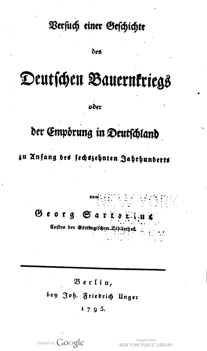 Der Deutsche Bauernkrieg zur Zeit der Reformation. Mit dem Bildnisse Thomas Müntzer’s.1834 BT: 6614 Standort: Wien – Österreichische Nationalbibliothek (ÖNB) Signatur: 38991-B
