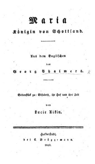Maria Königin von Schottland. Aus dem Englischen des Georg Chalmers. Seitenblick zu: Elisabeth, ihr Hof und ihre Zeit von Lucie Aikin.1823 BT: 4996 Standort: London - British Library Signatur: 10805.c.5.