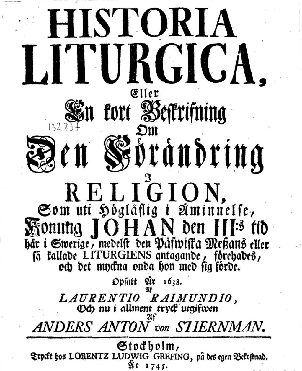 Historia Liturgica. Eller En kort Beskrifning Om Den Förändring I Religion, Som uti Höglåflig i Åminnelse, Konung Johan den IIIs tid här i Swerige, medelst den Påfwiska Meßans eller sä kallade Liturgiens antagande, förehades, och det myckna onda hon med sig förde.1745 BT: 7896