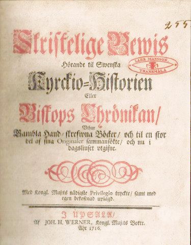 Skriftelige Beweis Hörande til Swenska Kyrckio Historien eller Biskops Chrönikan.1716 BT: 7900 Schlüssel: 7900b