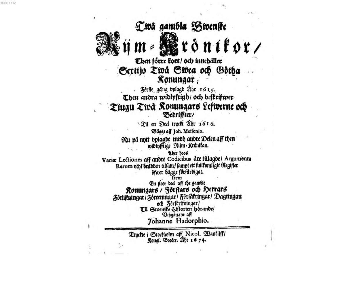 Twä gambla Swenske Rijm Krönikor. Then förre kort, och inhäller Sextijo Twä Swea och Götha Konungar etc.1674-76 BT: 7905