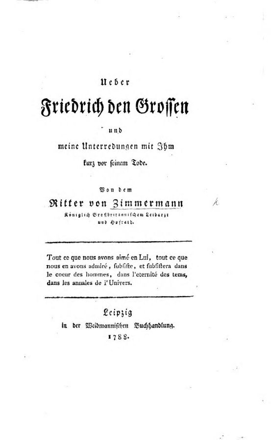 Ueber Friedrich den Grossen und meine Unterredungen mit Ihm kurz vor seinem Tode. Von dem Ritter von Zimmermann Königlich Großbritannischem Leibarzt und Hofrath.1788 BT: 6689