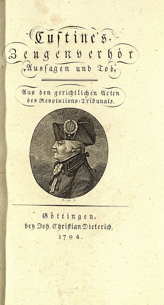 Denkwürdigkeiten des Generals Custine, von einem seiner Adjutanten. Aus dem Franzoesischen mit berichtigenden Anmerkungen des Uebersetzers.1795 BT: 5092