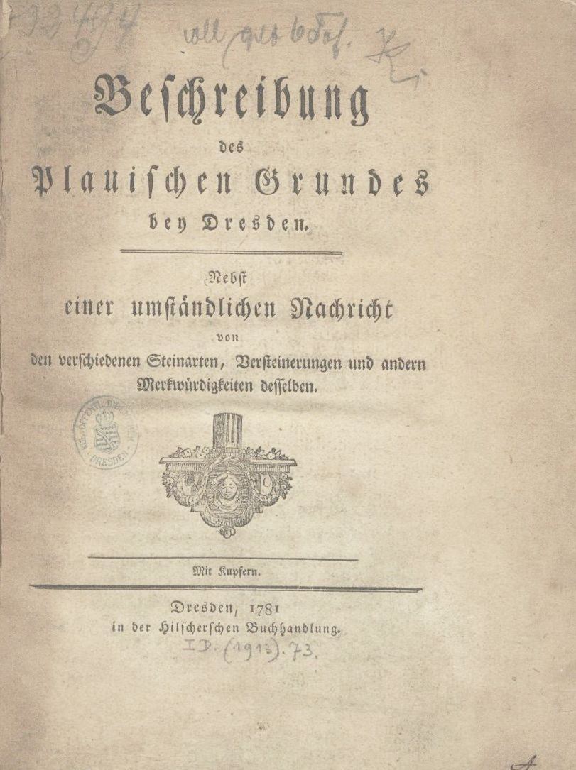 Beschreibung des Plauischen Grundes bey Dresden. Nebst einer umständlichen Nachricht von den verschiedenen Steinarten, Versteinerungen und andern Merkwürdigkeiten desselben.1781 BT: 6317