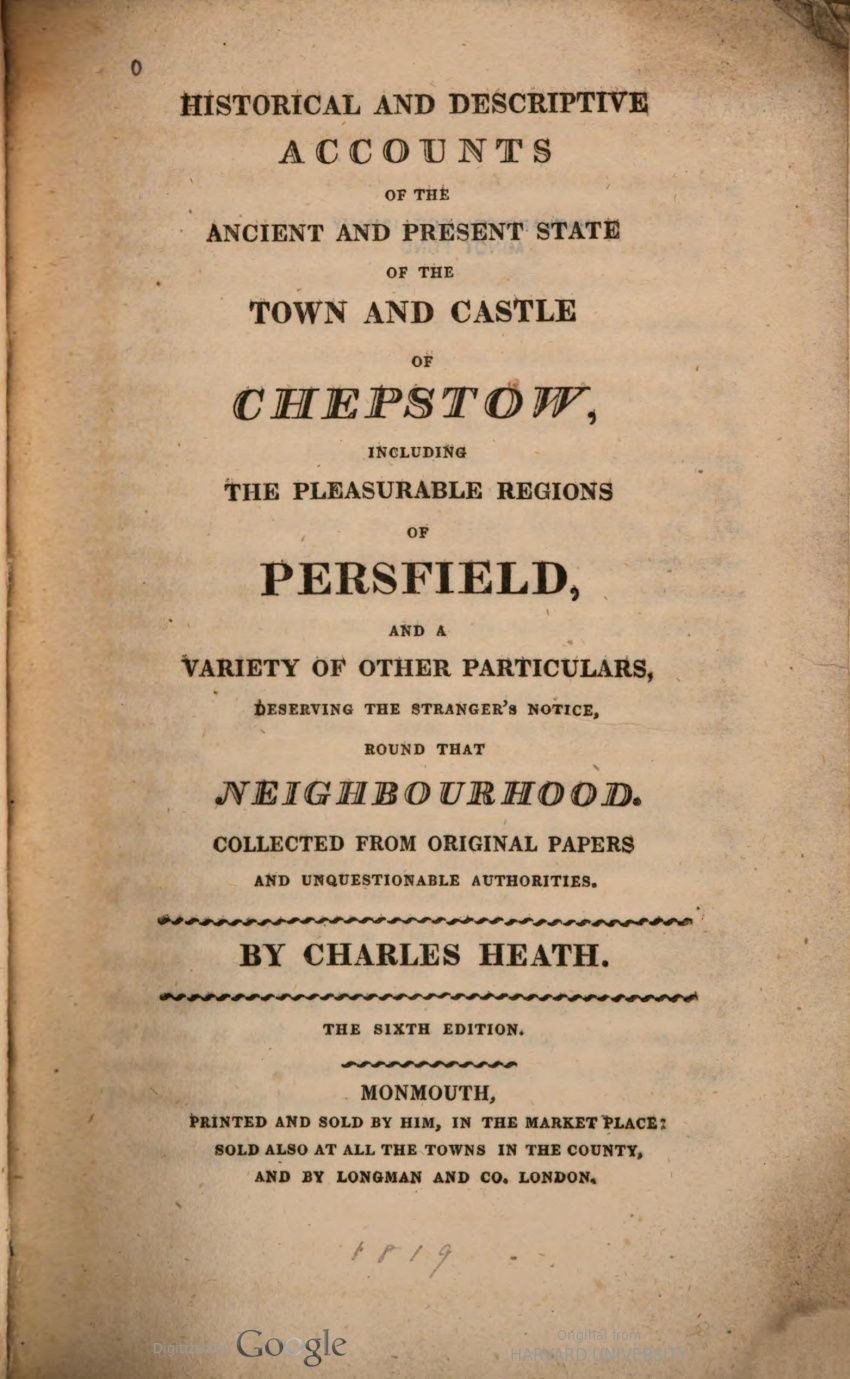 Historical And Descriptive Accounts Of The Ancient And Present State Of Town And Castle Of Chepstow. Including The Pleasurable Regions Of Persfield, And A Variety Of Other Particulars, Deserving The Stranger’s Notice, Round That Neighbourhood. Collected From Original Papers And Unquestionable Authorities.1819 [?] BT: 5451