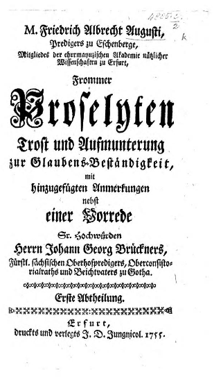 Frommer Proselyten Trost und Aufmunterung zur Glaubens-Beständigkeit. Mit hinzugefügten Anmerkungen nebst einer Vorrede Sr. Hochwürden Herrn Johann Georg Brückners. Erste Abtheilung.1755 BT: 4717 Standort: London - British Library Signatur: 4885.c.44.(2.)