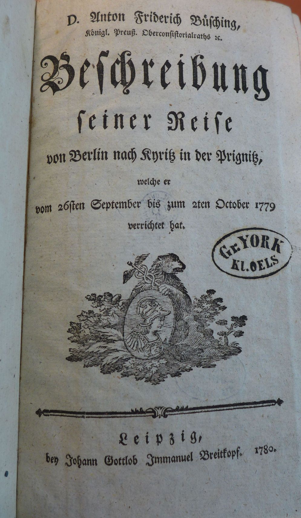 Beschreibung seiner Reise von Berlin nach Kyritz in der Prignitz, welche er vom 26sten September bis zum 2ten October 1779 verrichtet hat.1780 BT: 4941 Standort: Breslau - Universitätsbibliothek Wrocław Signatur: 036692