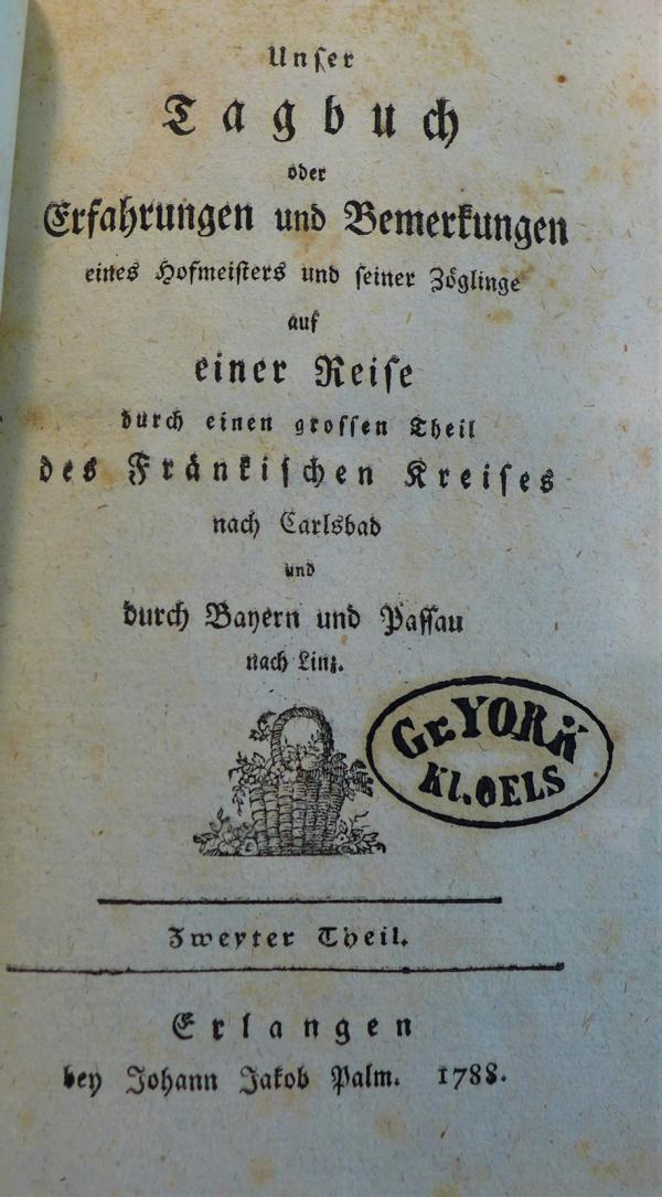 Unser Tagbuch. Oder Erfahrungen und Bemerkungen eines Hofmeisters und seiner Zöglinge auf einer Reise durch einen großen Theil des fränkischen Kreises nach Carlsbad und durch Bayern und Passau nach Linz.1788 BT: 4369 Standort: Breslau - Universitätsbibliothek Wrocław Signatur: 035924