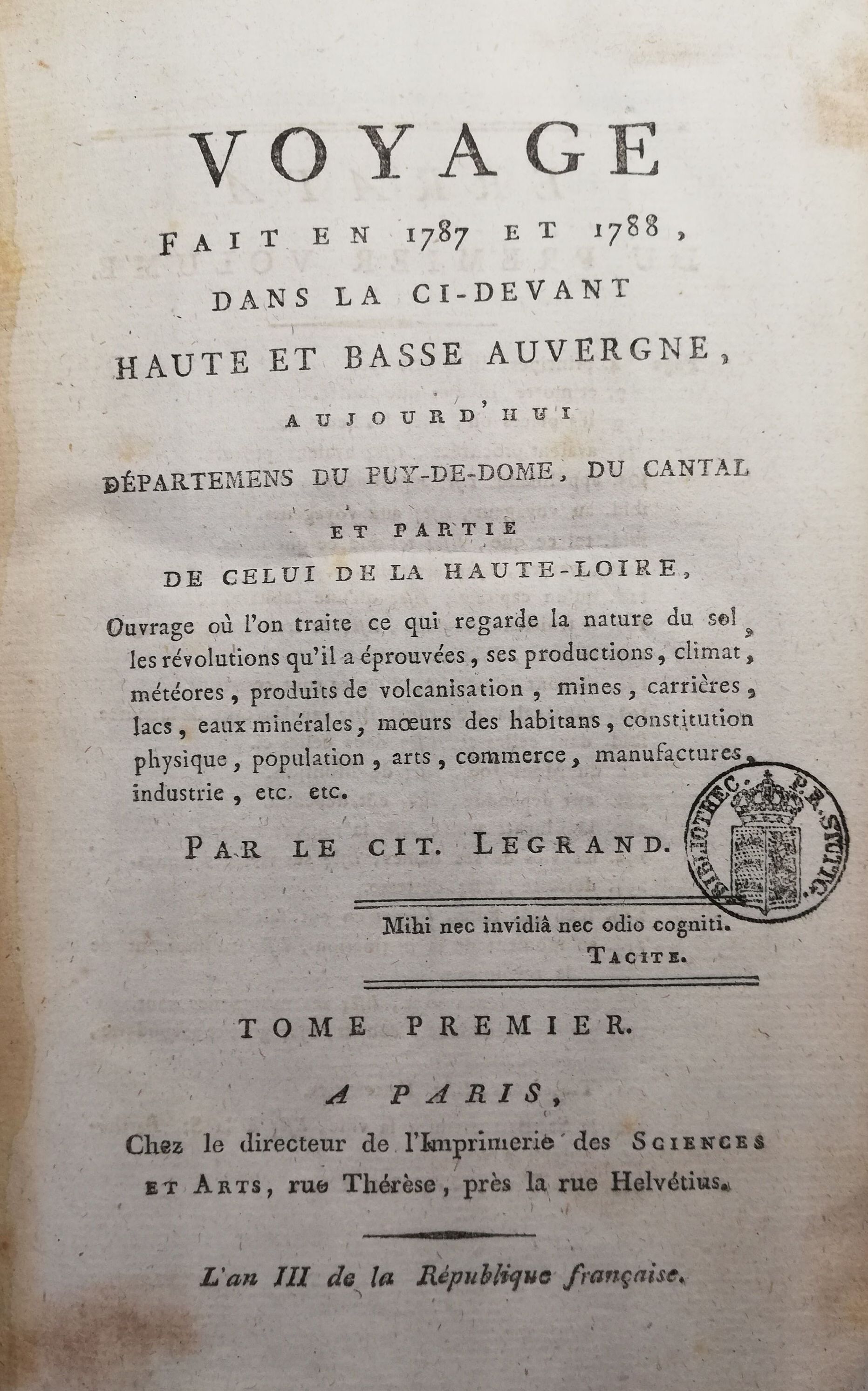 Voyage fait en 1787 et 1788, dans la ci-devant Haute et Basse Auvergne, aujourd'hui départemens du Puy-de-Dome, du Canal et Partie de celui de la Haute-Loire.1794 BT: 5677 Standort: Stuttgart - Württembergische Landesbibliothek Signatur: Geogr.oct.4030-1