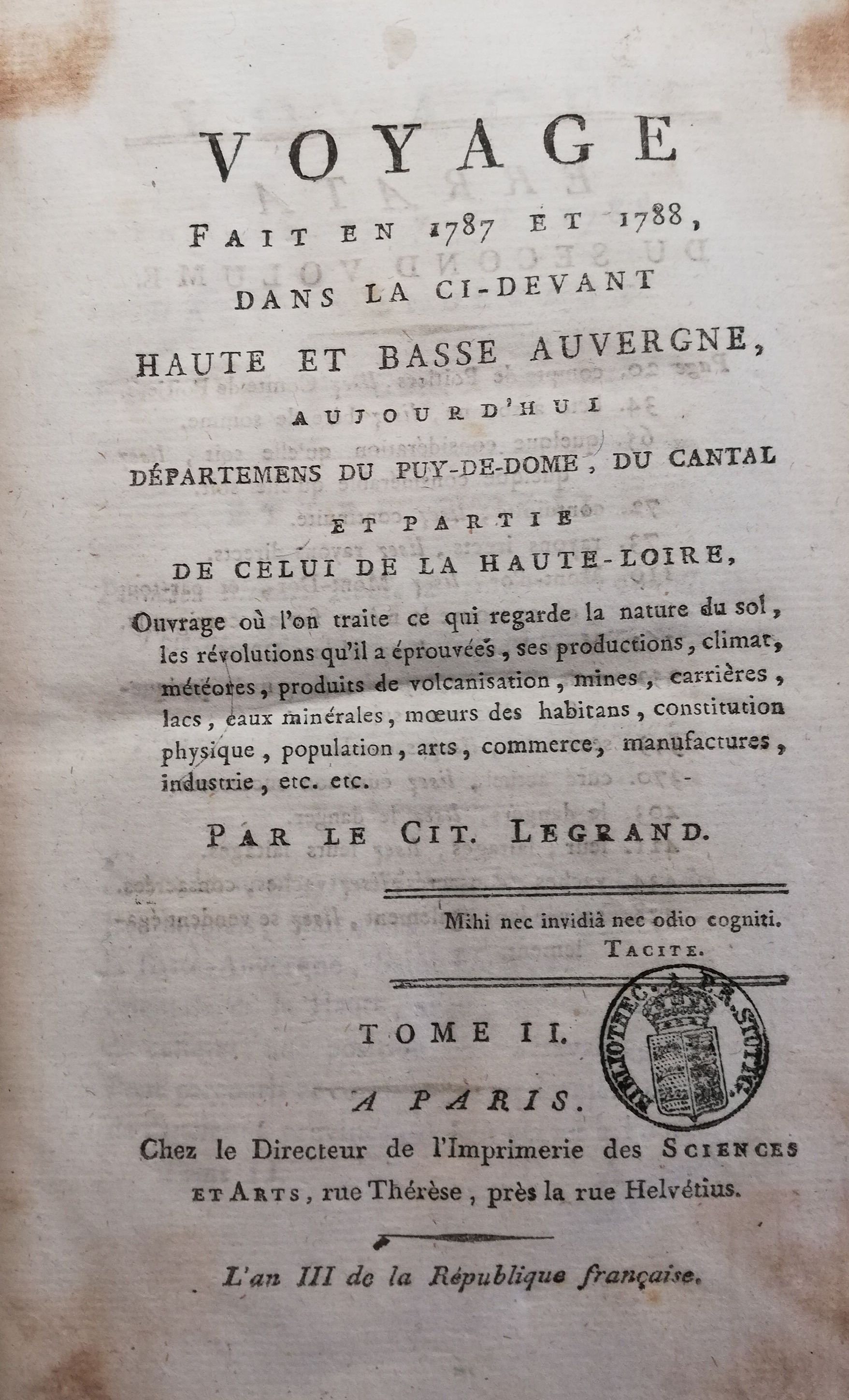 Voyage fait en 1787 et 1788, dans la ci-devant Haute et Basse Auvergne, aujourd'hui départemens du Puy-de-Dome, du Canal et Partie de celui de la Haute-Loire.1794 BT: 5677 Standort: Stuttgart - Württembergische Landesbibliothek Signatur: Geogr.oct.4030-2