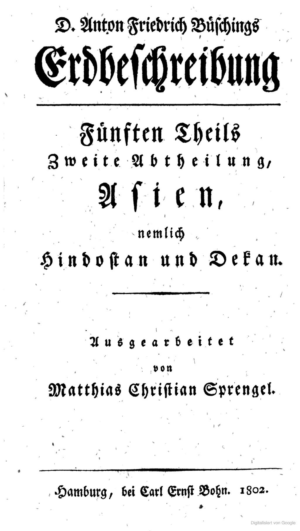 Hindostanische Denkwürdigkeiten. Ein Lesebuch zur Beherzigung für jeden Kosmopoliten.1799 BT: 5650 Standort: London - British Library Signatur: 10055.b.36.