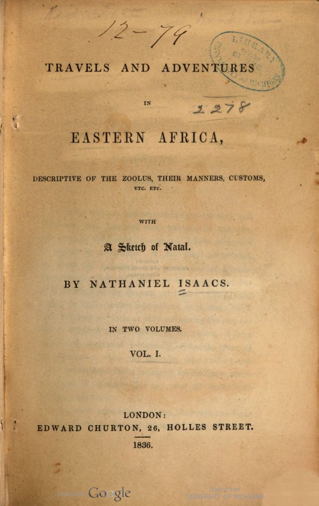 Travels and adventures in Eastern Africa. Descriptive of the Zoolus, their manners, customs, etc. etc.1836 BT: 5536