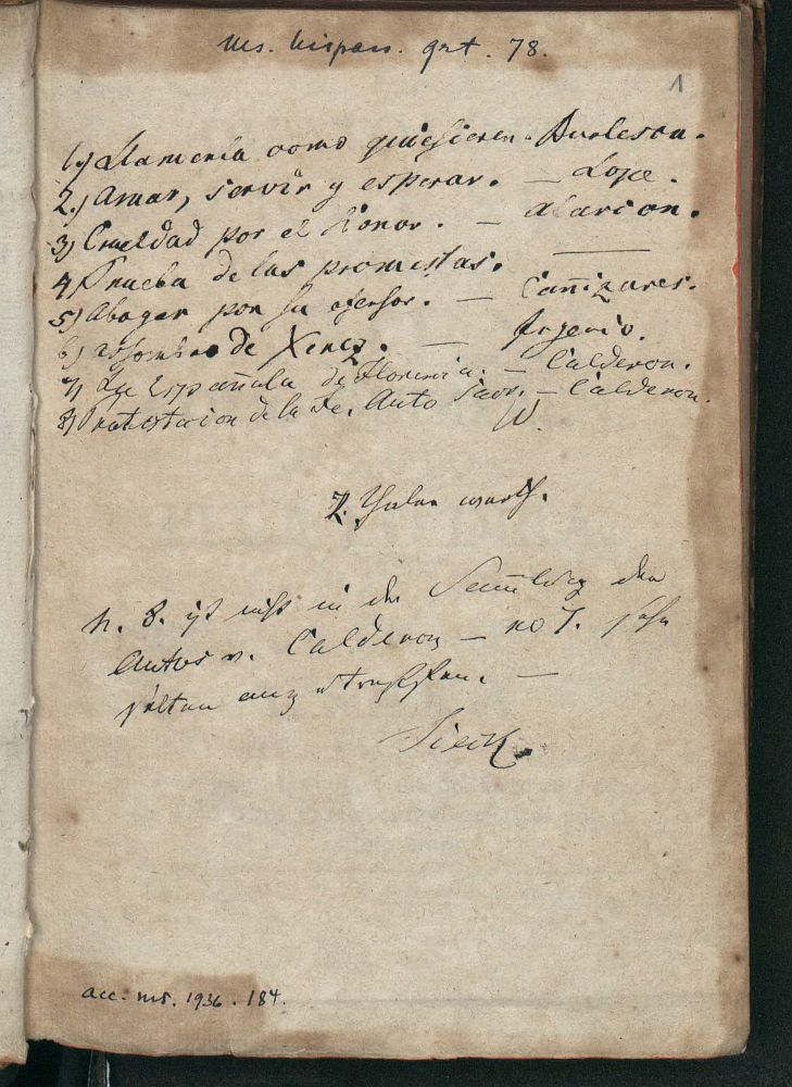 Inhaltsverzeichnis von Tiecks Hand, Tinte: 1.) Llamenla como quisieren. Burlesca. / 2.) Amar, servir y esperar. Lope. / 3.) Crueldad por el honor. Alarcon. / 4.) Prueba de las promesas. / 5.) Abogar por su ofensor. Cañizares. / 6.) Asombro de Xerez. Ingenio. / 7.) La española de Florencia. Calderon. / 8.) Protestacion de la Fe. Auto Sacr. - Calderon. / 2. Thaler werth. / N. 8. ist nicht in der Sammlung der / Autos v. Calderon - no. 7. sehr / selten anzutreffen. - / Tieck.