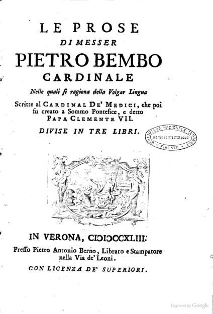 Le prose nelle quali si ragiona della volgar lingua scritte al cardinal De' Medici, che poi fu creato sommo Pontefice, e detto papa Clemente 7.