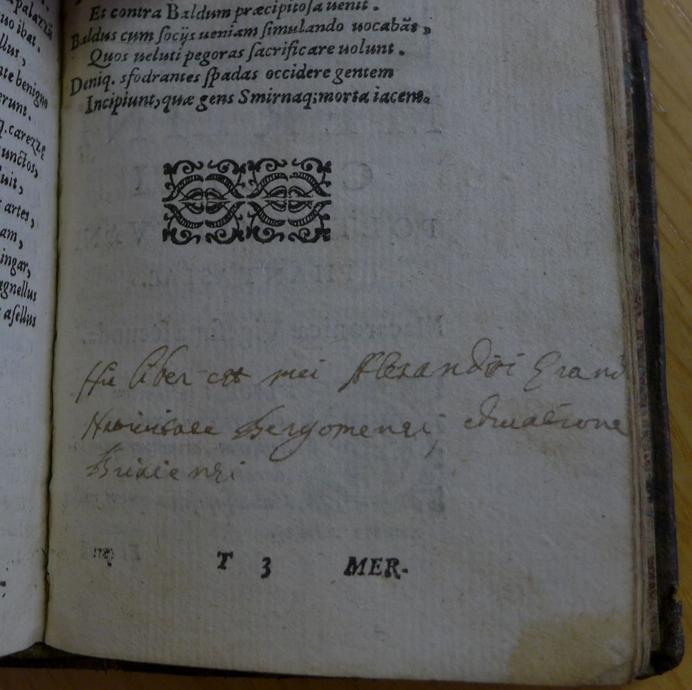 Mehrere Besitzvermerke von fremder, älterer Hand, Tinte (S. 367: Hic liber est mei Alexandri Granchi Habinitate Bengomenzi, educatione Brinicagi, S. 393: Hic liber est mei Alexandri Granchi... , S. 437: Tinte: Hic liber est mei..., S. 474: Tinte: Hic liber est..., S. 532: Durchgestrichen, kaum lesbar, anzunehmender Weise: Hic liber...)