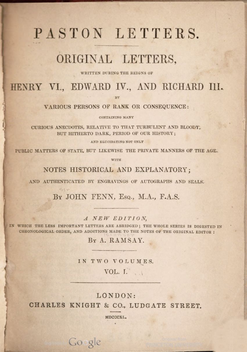 Original letters, written during the reigns of Henry VI., Edward IV., and Richard III. by various persons of rank or consequence: containing many curious, relative to that turbulent and bloody, but hitherto dark, period of our history; and elucidating not only public matters of state, but likewise the private manners of the age. With notes historical and explanatory.