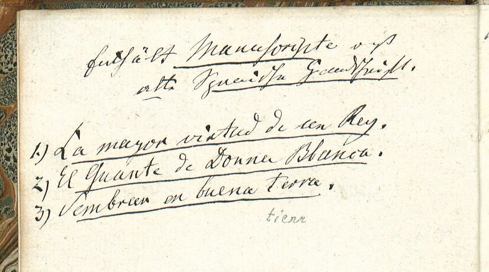 Eintrag Tiecks, Tinte: Enthält [unterstrichen: Manuscripte] u. ist alte [unterstrichen: spanische Handschrift.] / 1.) [unterstrichen: La mayor virtud de un Rey.] / 2) [unterstrichen: El Guante de Donna Blanca.] / 3) [unterstrichen: Sembrar en buena terra.]