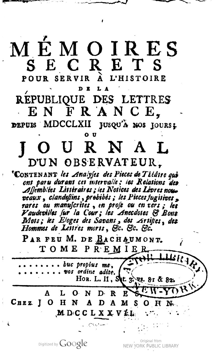 Mémoires secrets pour servir a l'histoire de la république des lettres en France.