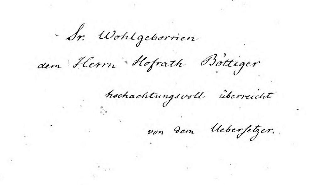 Widmung Tinte: Sr. Wohlgebornen / dem Herrn Hofrath Böttiger / hochachtungsvoll überreicht / von dem Uebersetzer. /