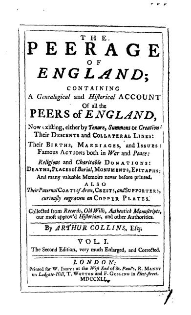 Containing a genealogical and historical account of all the peers of England, Now existing, either by Tenure, Summons or Creation: Their Descents and Collateral Lines: Their Births, Marriages, and Issues: Famous Actions both in War and Peace: Religious and Charitable Donations: Deaths, Places of Burial, Monuments, Epitaphs: And many valuable Memoirs never before printed. Also Their Paternal Coats of Arms, Crests, and Supporters, curiously engraven on Copper Plates. Collected from Records, Old Wills, Authentick Manuscripts, our most approv'd Historians, and other Authorities.