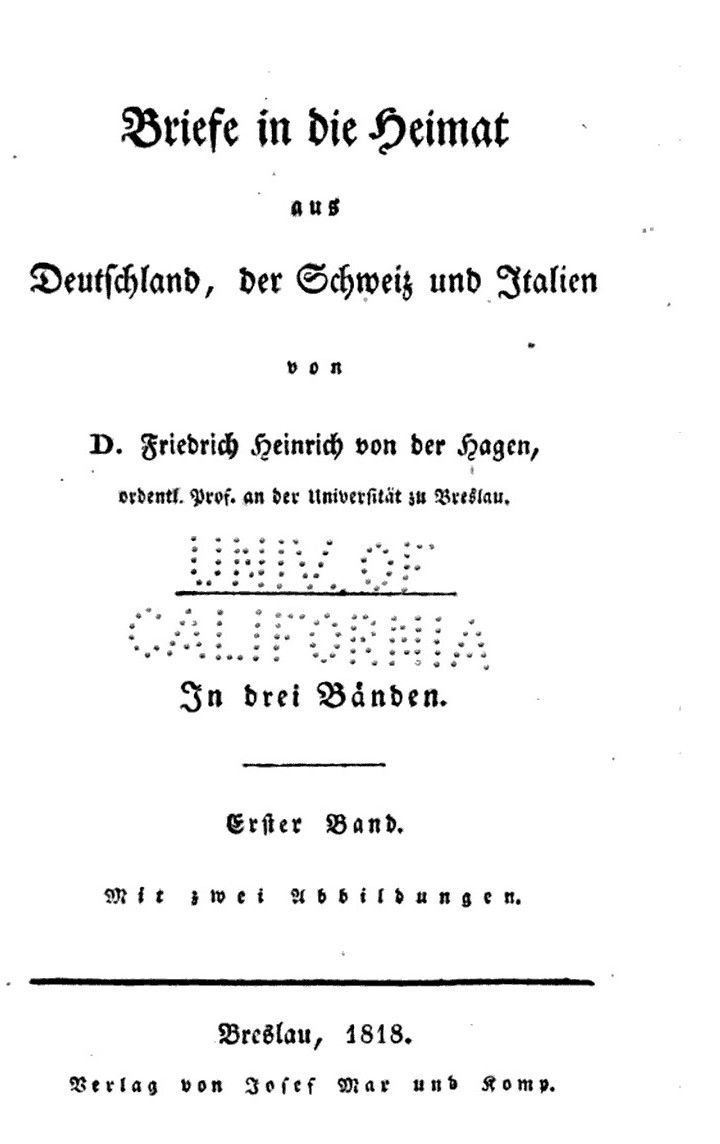 Von der Hagen schreibt am 9.1.1819 an Tieck, dass dieser mittlerweile "zwei Bände gedruckter Briefe" von ihm erhalten haben müsste, verspricht zudem Übersendung weiterer Bände (Vgl. Briefe an Ludwig Tieck. Ausgewählt und hg. v. Karl von Holtei. Vier Bände. Breslau: Eduard Trewendt 1864, Band 1, S. 275–277).