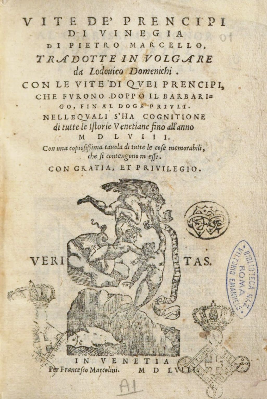 Tradotte in Volgare. Con Le Vite Di Qvei Prencipi, Che Fvrono Doppo Il Barbarigo, Fin Al Doge Privli. Nelle Qvali S’Ha Cognitione di tutte le Istorie Venetiane fino all’anno MDLVIII. Con una copiosißima tauola di tutte le cose memorabili, che si contengono in esse.