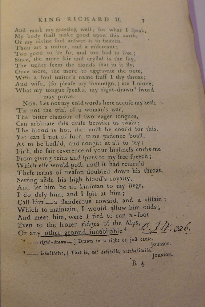 Marginalien Tiecks. d. r. n. r. Exemplaire unique et de la plus grande importance, contenant des notes sans nombre de la main de M. Tieck. Ces notes renferment les fruits d'une étude de plus de 40 ans sur le grand poëte, par son plus grand traducteur et commentateur et forment le texte du grand ouvrage sur Shakspeare, promis depuis si lontemps. Titel in BT: The plays of Shakespeare with the corrections and illustrations of various commentators, to which are added notes by Johnson and Steevens.