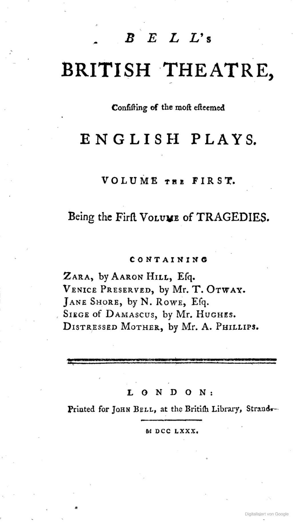 Enthält: I) Garrick, David: The country girl. A Comedy. 91 S. II) Beaumont, Francis; Fletcher,John: The chances. A comedy. 103 S.III) Steele, Richard: The tender husband or, the accomplished fools. A comedy. 91 S. IV) Farquhar, George: The Beaux Stratagem. A comedy. S.110, V) Dryden, John: The Spanish Fryar, or, the double discovery. A comedy. 136 S.