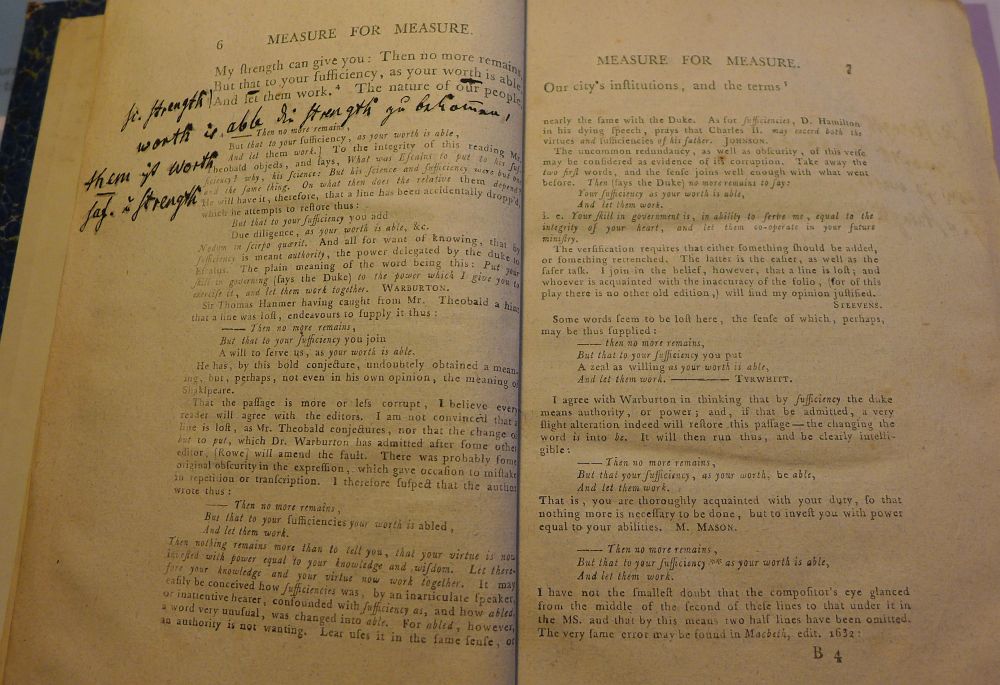Marginalien Tiecks. d. r. n. r. Exemplaire unique et de la plus grande importance, contenant des notes sans nombre de la main de M. Tieck. Ces notes renferment les fruits d'une étude de plus de 40 ans sur le grand poëte, par son plus grand traducteur et commentateur et forment le texte du grand ouvrage sur Shakspeare, promis depuis si lontemps. Titel in BT: The plays of Shakespeare with the corrections and illustrations of various commentators, to which are added notes by Johnson and Steevens.