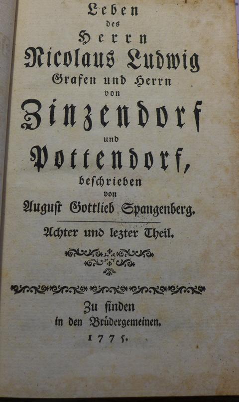 8 part. en 6 vols. portr. s.l. veau. [Titel in BT 1849: Leben des Herrn. Nic. Ludw. Grafen von Zinzendorff und Pottendorff.]