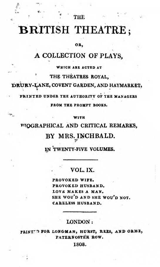 Provoked Wife (85S.). – Provoked Husband (100S.). – Love makes a man (77S.). – She wou’d and she wou’d not (86S.). - Careless Husband (94S.)