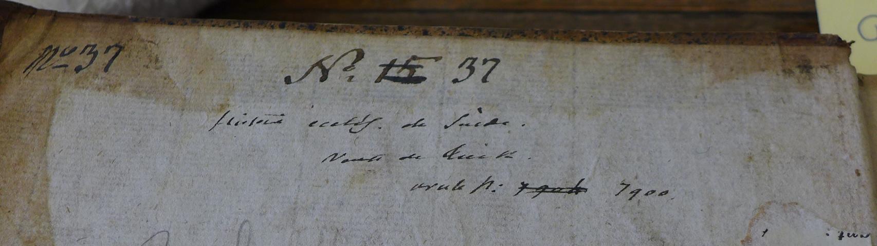 Tinte: N.o 37 / [durchgestrichen: N.o 15] 37 / Histoire ecclés. De Suède. / Vente de Tieck / [?] n: [durchgestrichen: 7901] 7900