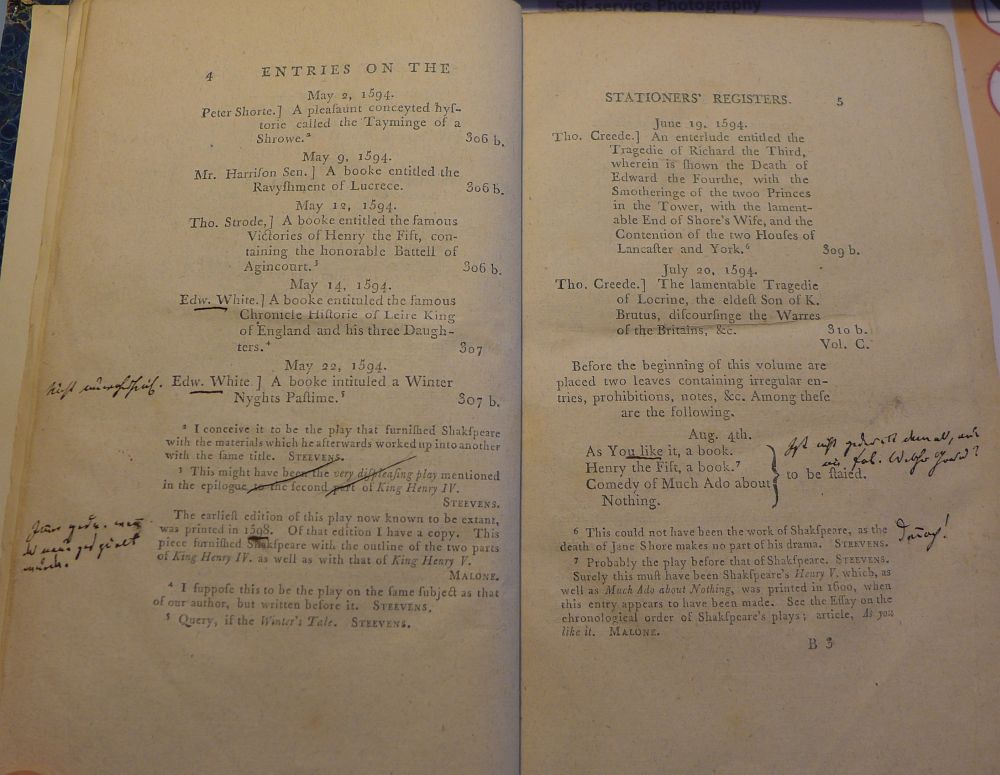 Marginalien Tiecks. d. r. n. r. Exemplaire unique et de la plus grande importance, contenant des notes sans nombre de la main de M. Tieck. Ces notes renferment les fruits d'une étude de plus de 40 ans sur le grand poëte, par son plus grand traducteur et commentateur et forment le texte du grand ouvrage sur Shakspeare, promis depuis si lontemps. Titel in BT: The plays of Shakespeare with the corrections and illustrations of various commentators, to which are added notes by Johnson and Steevens.