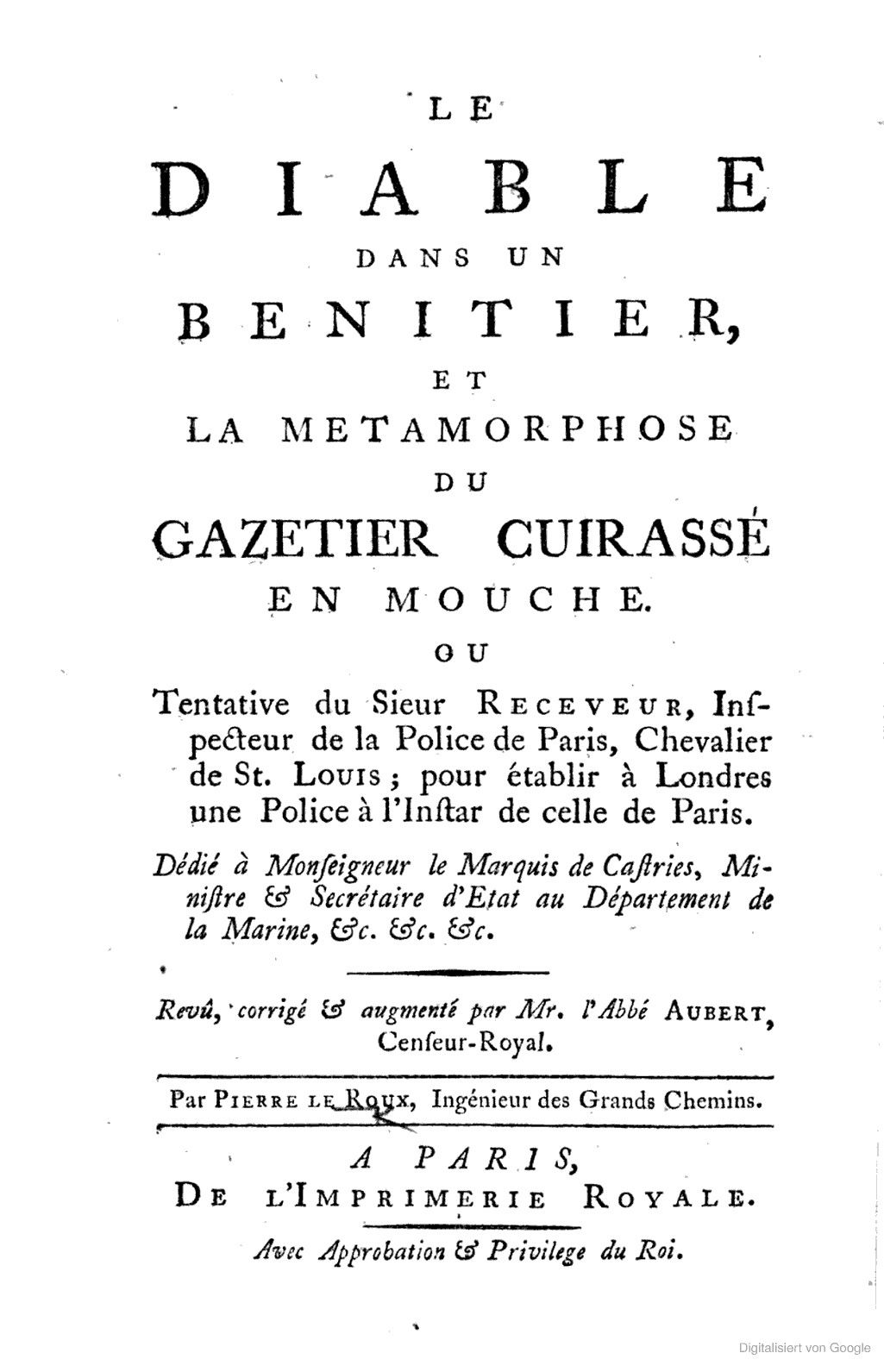 Le diable dans un Bernitier, et la metamorphose du Gazetier cuirasse en mouche, on tentative du Sr. Receveur, Inspect. de la Police, pour établir à Londres une Police à l’Instar de celle de Paris.
