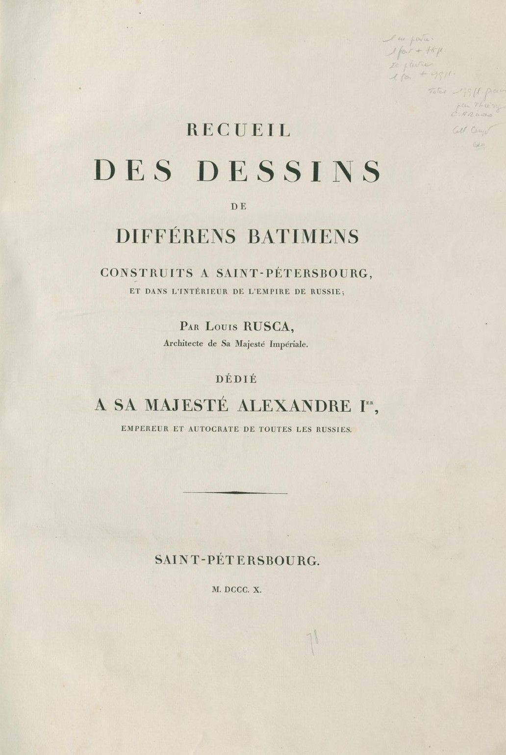 Recueil de dessins de différences bâtimens construite à St. Petersbourg et dans l’intérieur de l’empire de Russie.