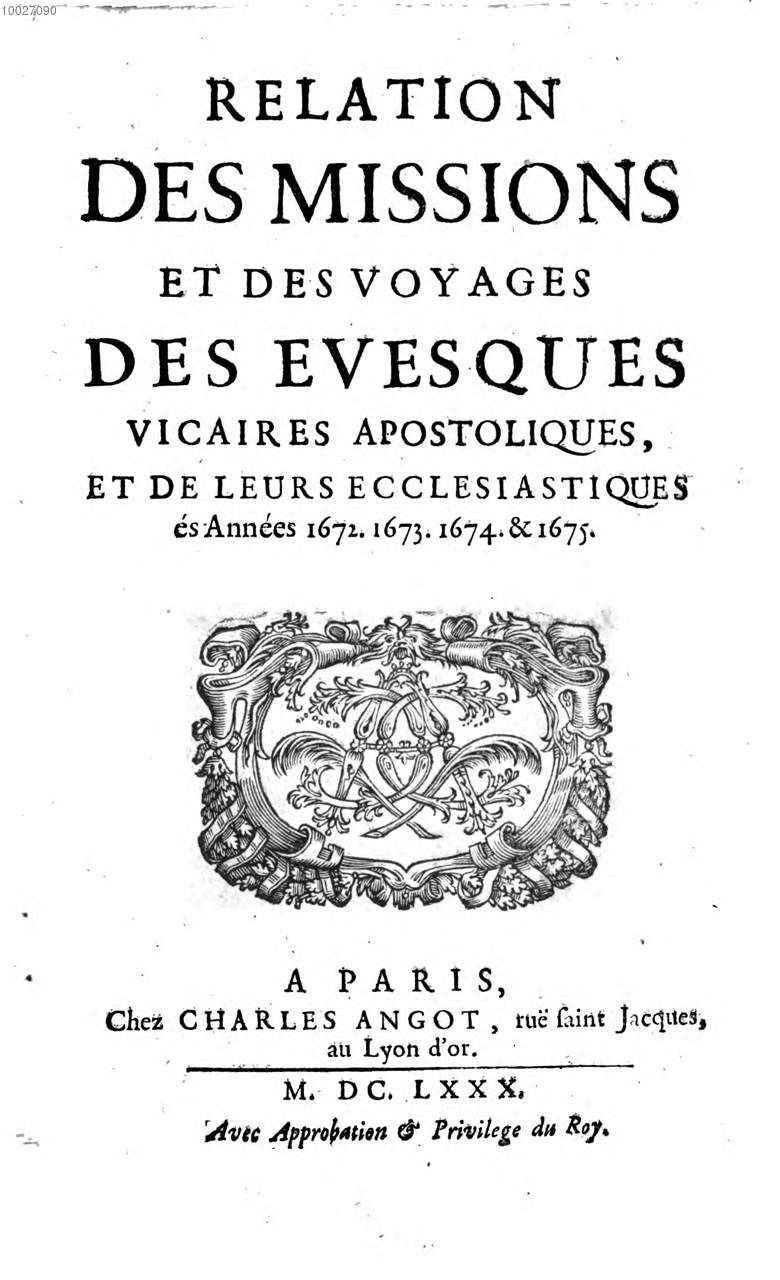 Relations des missions et des voyages des Evesques, Vicaires Apostoliques és années 1672-75.