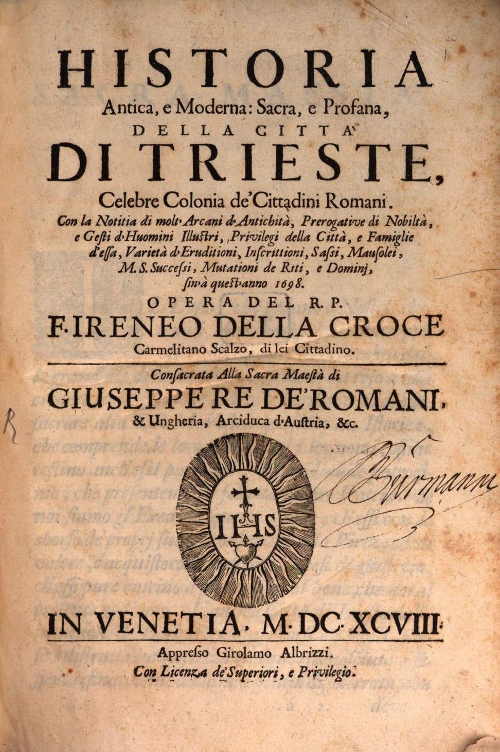 Con la Notitia di molt’Arcani d’Antichità, Prerogative di Nobiltà, e Gesti d’Huomini Illustri, Privilegi della Città, e Famiglie d’essa, Varietà d’Eruditioni, Inscrittioni, Sassi, Mausolei, M. S. Successi, Mutationi de Riti, e Dominj, sin’à quest’anno 1698.