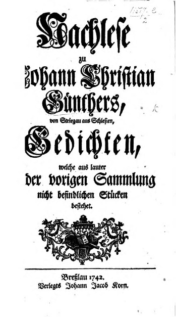 Nachlese zu Johann Christian Günthers, von Striegau aus Schlesien, Gedichten, welche aus lauter der vorigen Sammlung nicht befindlichen Sücken bestehet.
