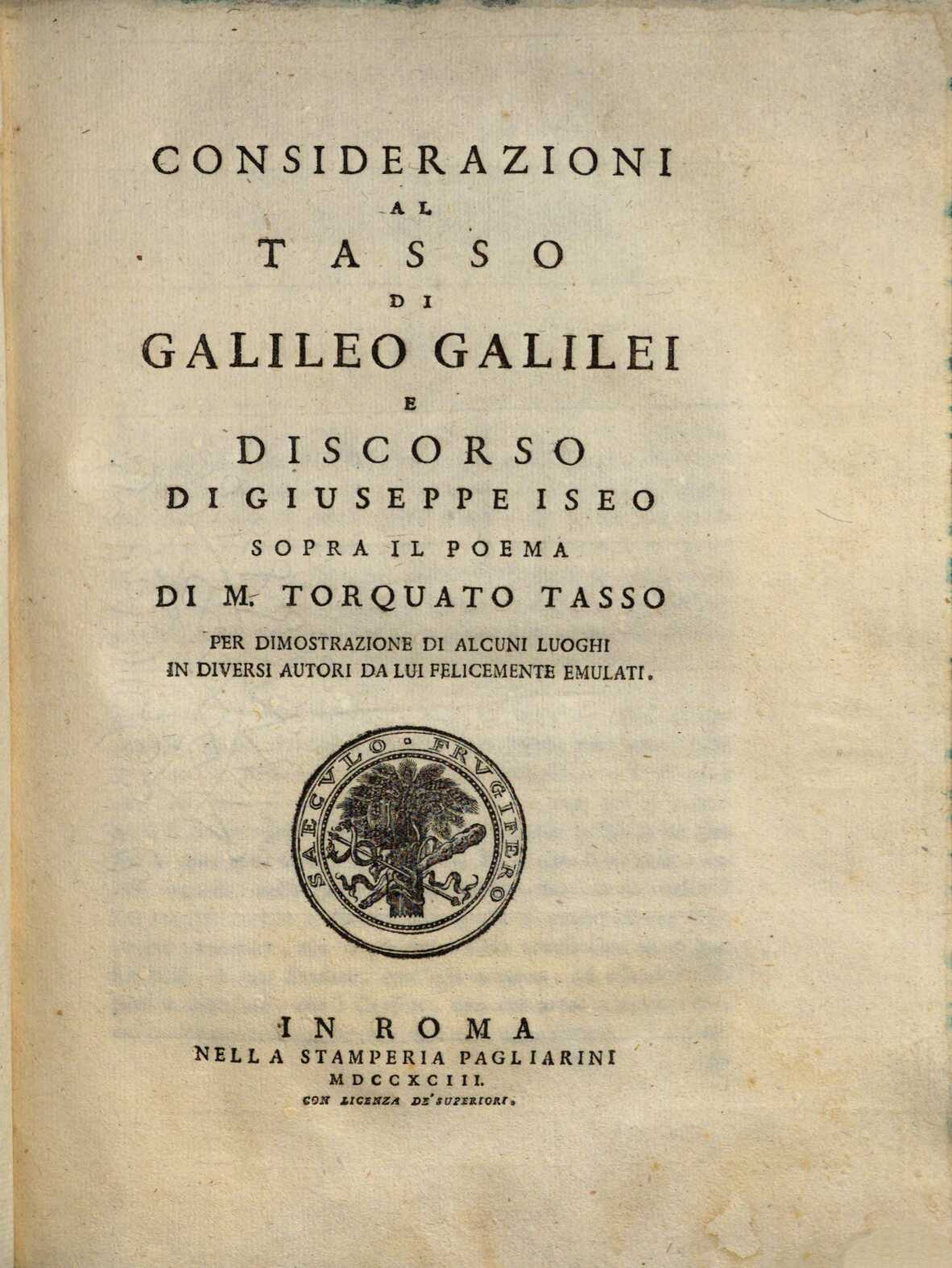 • Galilei, Galileo und Iseo, Giuseppe Considerazioni al Tasso e discorso sopra il poema di M. Torquato Tasso per dimostrazione di alcuni luoghi in diversi autori da lui felicemente emulati.