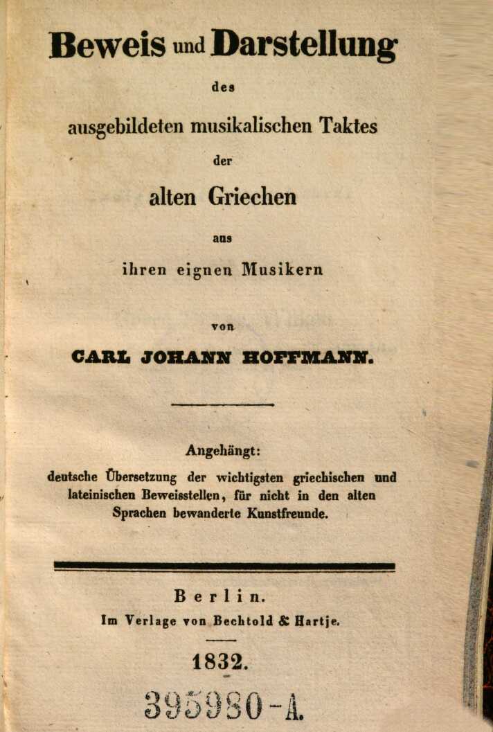 • Hoffmann, Carl Johann Beweis und Darstellung des ausgebildeten musikalischen Taktes der alten Griechen aus ihren eignen Musikern. Angehängt: deutsche Übersetzung der wichtigsten griechischen und lateinischen Beweisstellen, für nicht in den alten Sprachen bewanderte Kunstfreunde.
