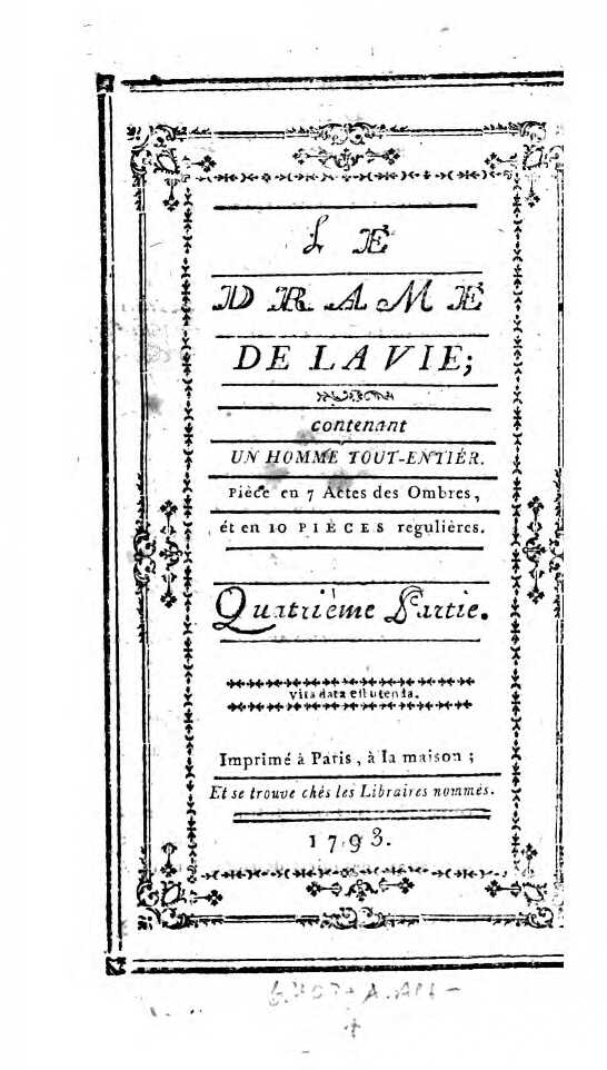 Le Drame de la Vie, contenant un homme tout-entier. Piece en 13 Actes des Ombres, et en 10 Pieces regulieres. Quatrième Partie.1793 BT: 3186 Standort: Wien – Österreichische Nationalbibliothek (ÖNB) Signatur: 6408-A.4