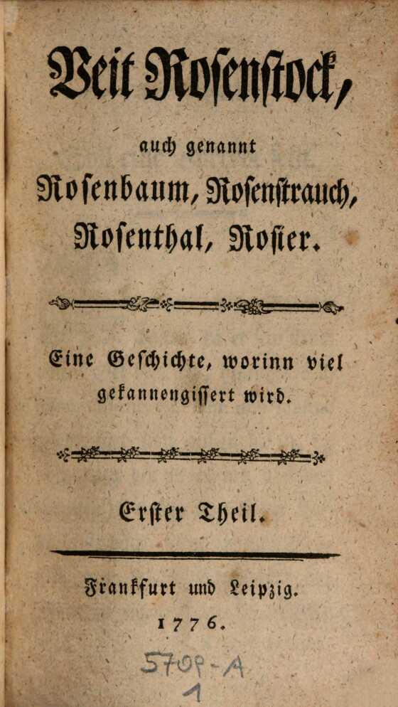 Veit Rosenstock, auch genannt Rosenbaum, Rosenstrauch, Rosenthal, Rosier. Eine Geschichte, worinn viel gekannengissert wird. Erster Theil.1776 BT: 1337 Standort: Wien – Österreichische Nationalbibliothek (ÖNB) Signatur: 5709-A.1