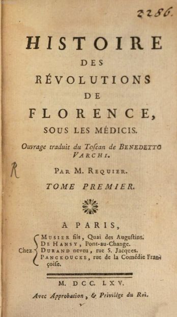 Histoire des révolutions de Florence, sous les Médicis. Ouvrage traduit du Toscan.1765 BT: 6547 Standort: London - British Library Signatur: 1316.c.1-3.