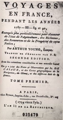 Voyages en France, pendant les années 1787-88-89 et 90. Entrepris plus particuliérement pour s’assurer de l’état de l’agriculture, des richesses, des ressources et de la prospérité de cette nation.1794 BT: 6680 Standort: Breslau - Universitätsbibliothek Wrocław Signatur: 035479