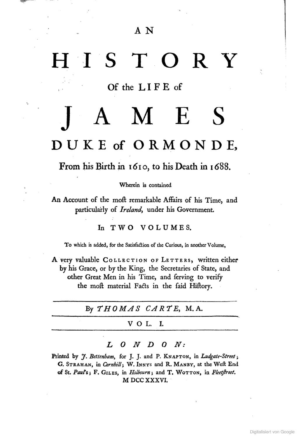 An history of the life of James, duke of Ormonde from his birth in 1610 to his death in 1688.