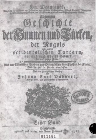 Allgemeine Geschichte der Hunnen und Türken, der Mogols und anderer occidentalischen Tartarn, vor und nach Christi Geburt bis auf jetzige Zeiten. Aus den Chinesischen Büchern und orientalischen Handschriften der Königl. Bibliothek in Paris verfasset.1769 BT: 5114 Standort: Breslau - Universitätsbibliothek Wrocław Signatur: 012161