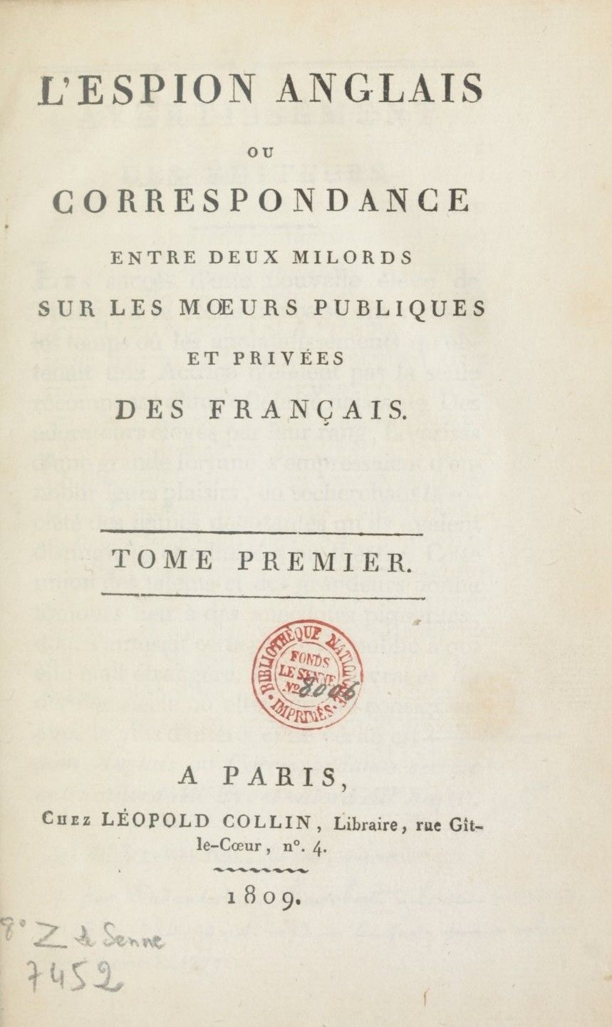 L’Espion anglais. Ou Correspondance entre deux milords sur les moeurs publiques et privées des Français.1809 BT: 5208 Standort: London - British Library Signatur: 12352.f.7.